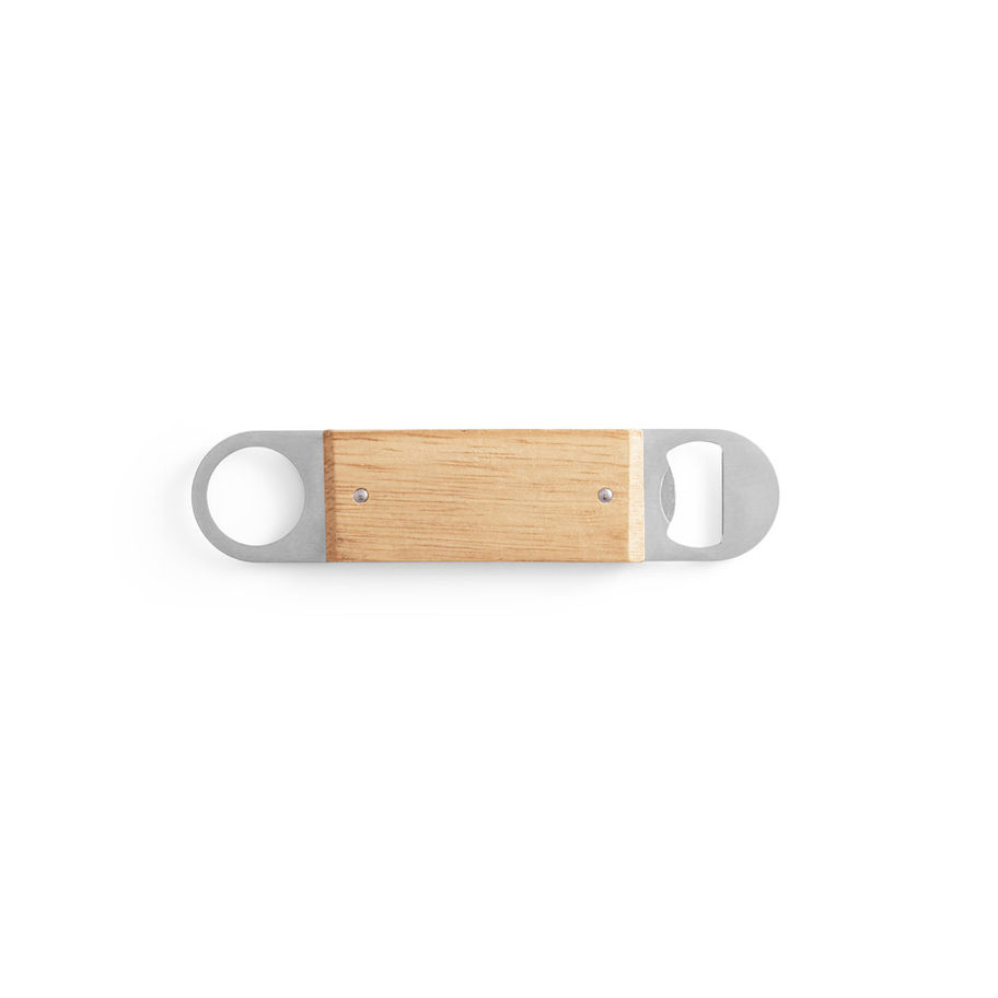 Abridor de garrafas em aço inox com corpo em madeira de faia. Distintivo dos restantes por conter um abridor de um lado e uma argola para facilitar sua arrumação. A cor e o resultado da impressão nos materiais naturais pode variar entre produtos.
