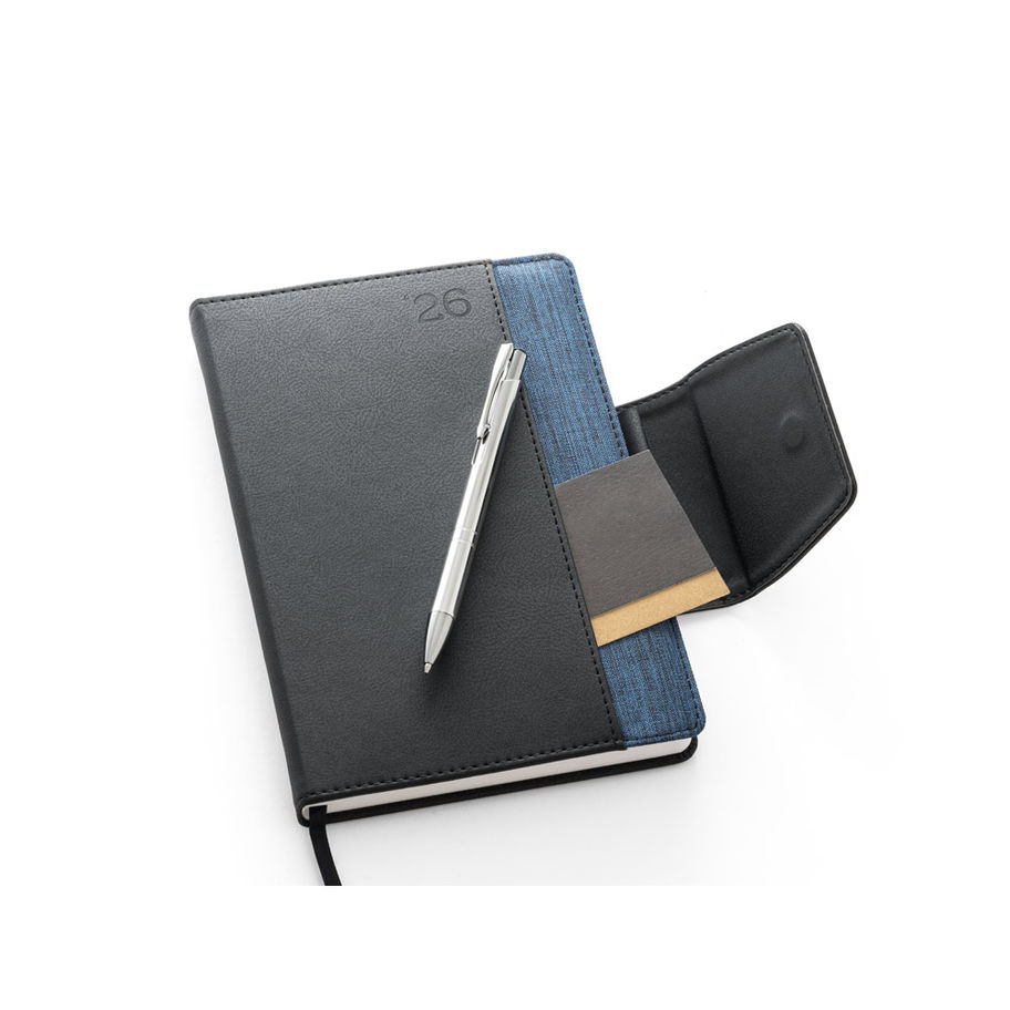Agenda A5 em PU e tecido em poliéster. Está organizada num plano diário. Possui fecho magnético, bolso frontal, suporte para esferográfica (inclusa) e marcador em fita. Fornecida com bolsa de non-woven.
