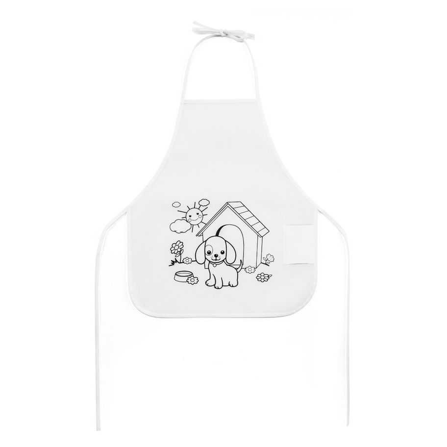 Avental de criança para colorir em non-woven (80 g/m²) com desenho impresso e bolso lateral. 6 gizes de cera inclusos.