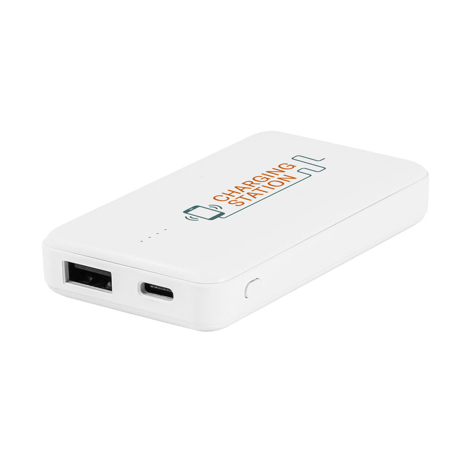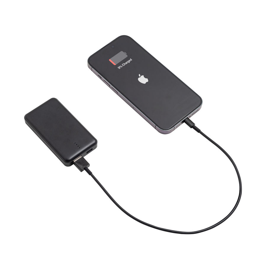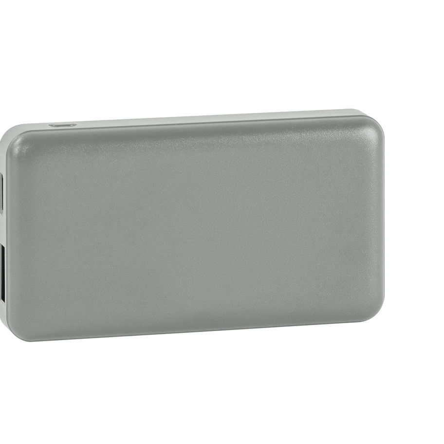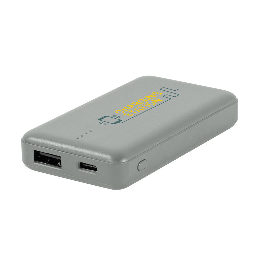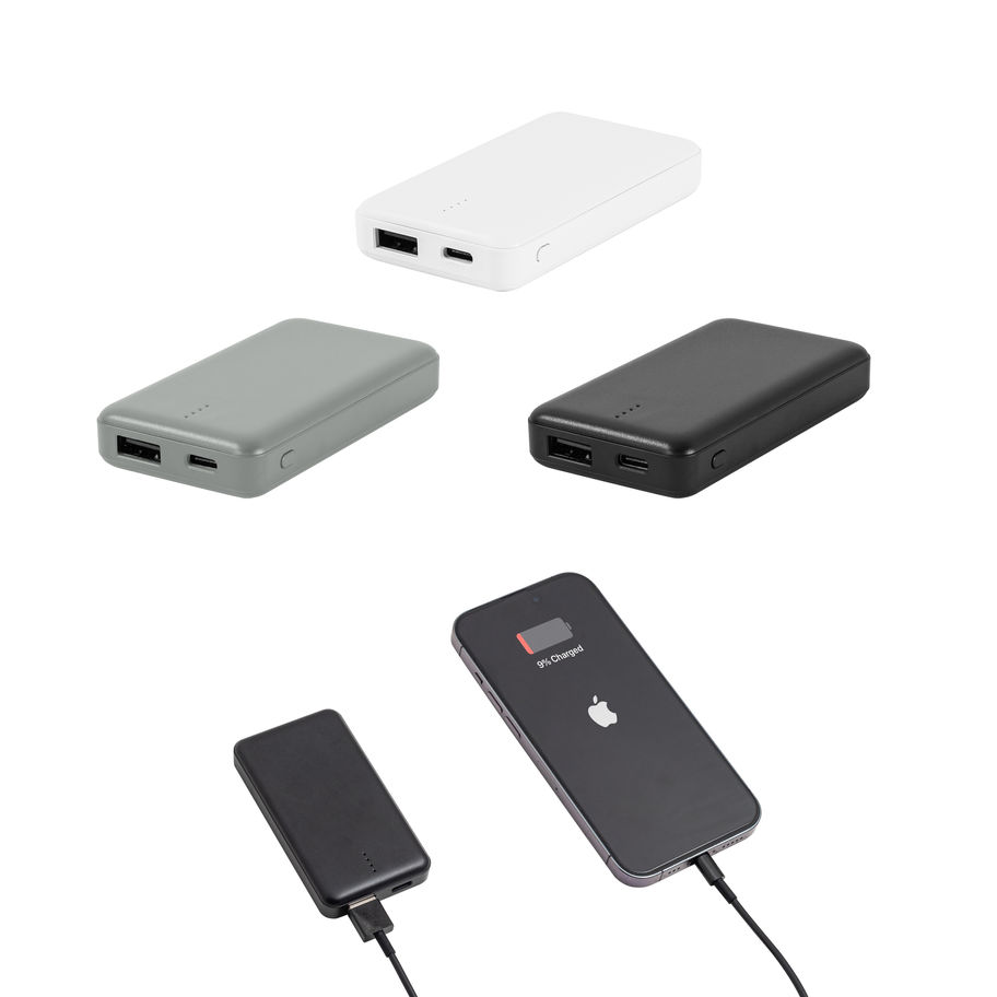 Bateria portátil em ABS 100% reciclado. Leve e com dimensões extremamente reduzidas é a solução perfeita para levar com você a qualquer lugar e garantir a bateria necessária em situações de emergência. Bateria portátil com capacidade de 4.000 mAh, indicador de nível de carga, uma porta de entrada USB-C e uma porta de saída USB-A. Incluso um cabo de carregamento USB-C. Fornecida em caixa presente de papel kraft reciclado.