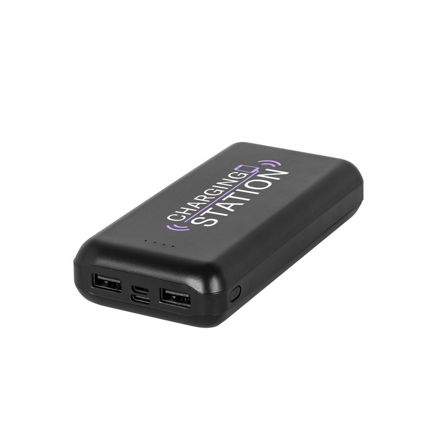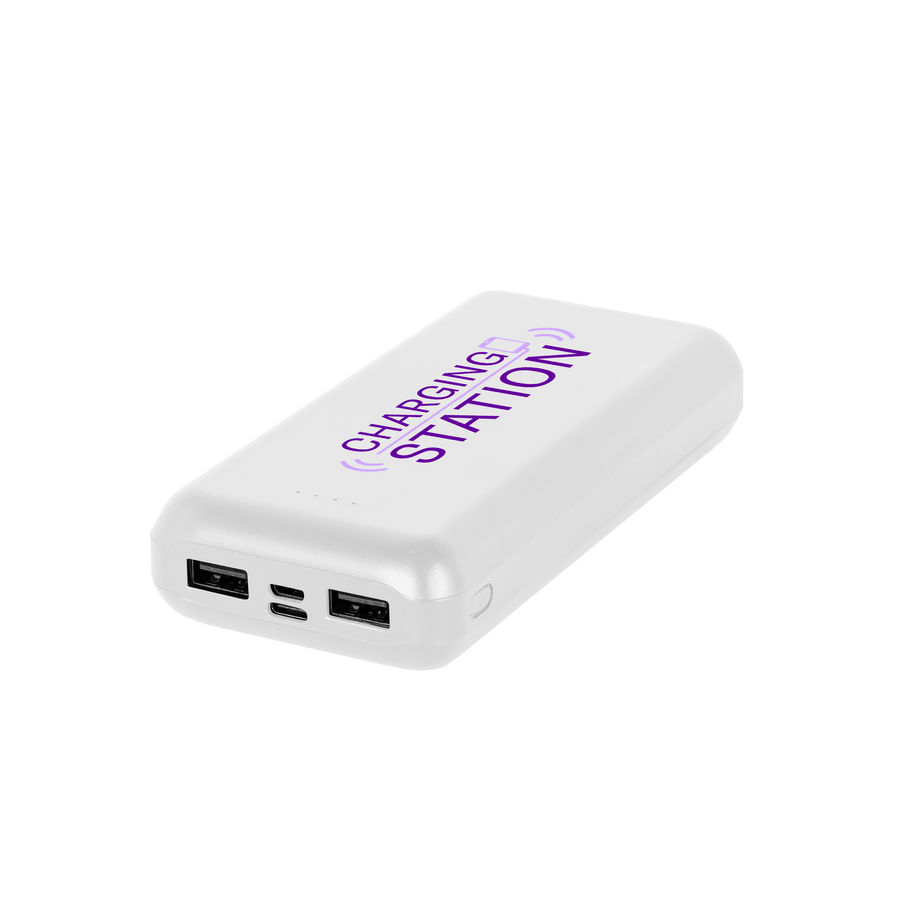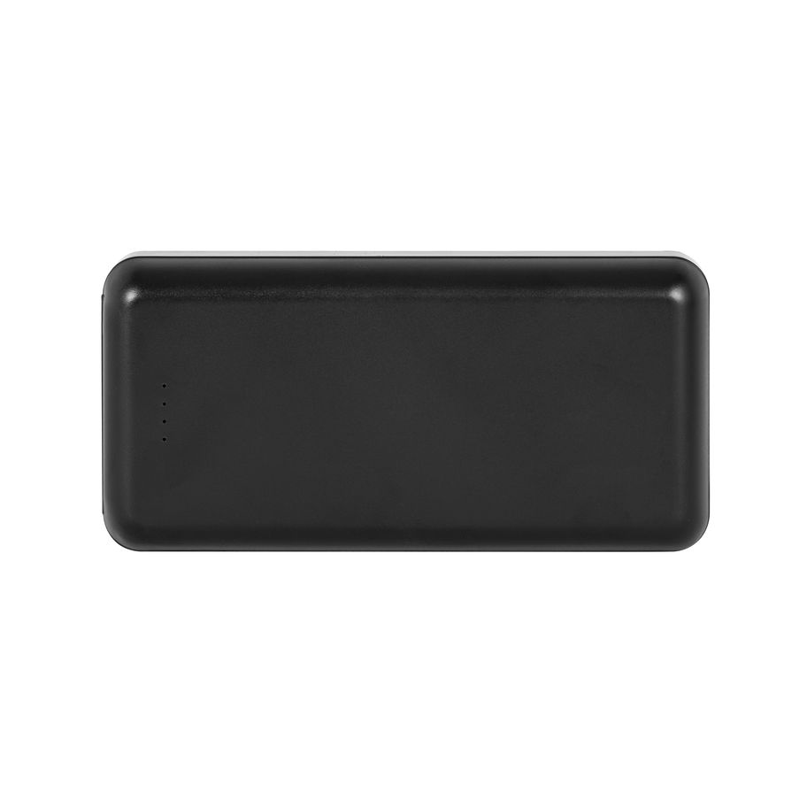 Baterial portátil em ABS 100% reciclado, com capacidade de 10.000 mAh ou 20.000 mAh. Bateria portátil com indicador de nível de carga, uma porta de entrada/saída USB-C, uma porta de entrada microUSB e duas portas de saída USB-A. Incluso um cabo de carregamento USB-C. Fornecida em caixa presente de papel kraft reciclado.