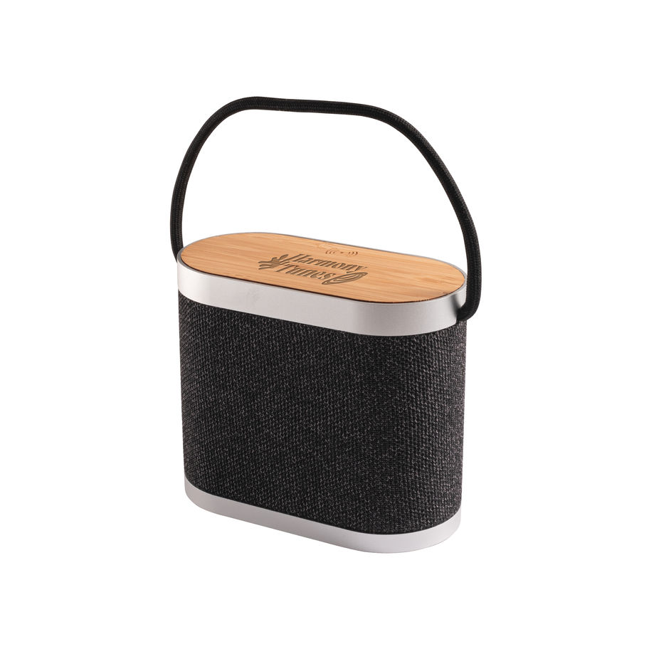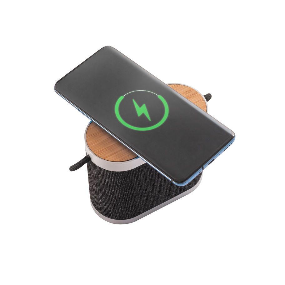 Caixa de som de bambu e poliéster reciclado com carregador wireless