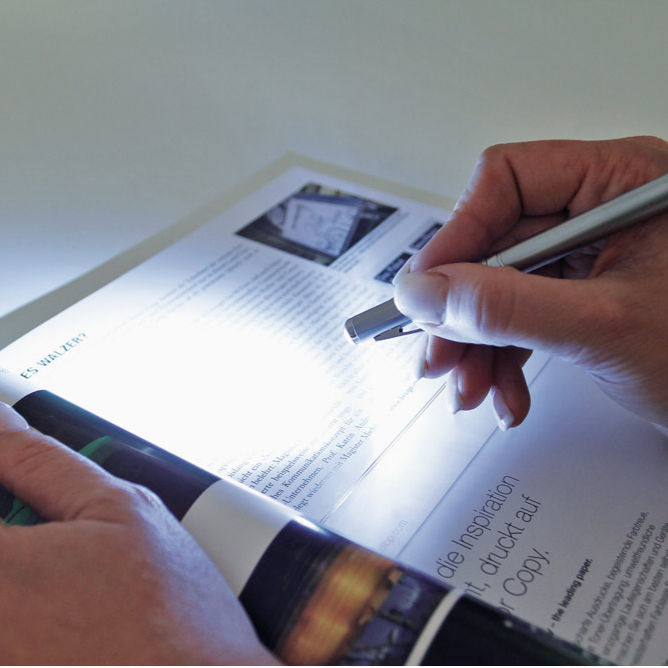 Esferográfica multifunções em metal com clipe de metal. Esferográfica com mini lanterna LED, apontador laser e ponteira touch. Incluso 3 pilhas LR41. Escrita em azul. Fornecida em estojo metálico com forro de veludo.