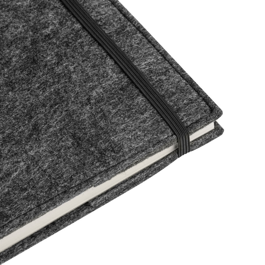 Capa em feltro 100% reciclado, com caderno A5 no interior. O caderno removível contém a capa em papel 100% reciclado, bem como 160 páginas pautadas (70 g/m²) cor de marfim também em papel 100% reciclado.