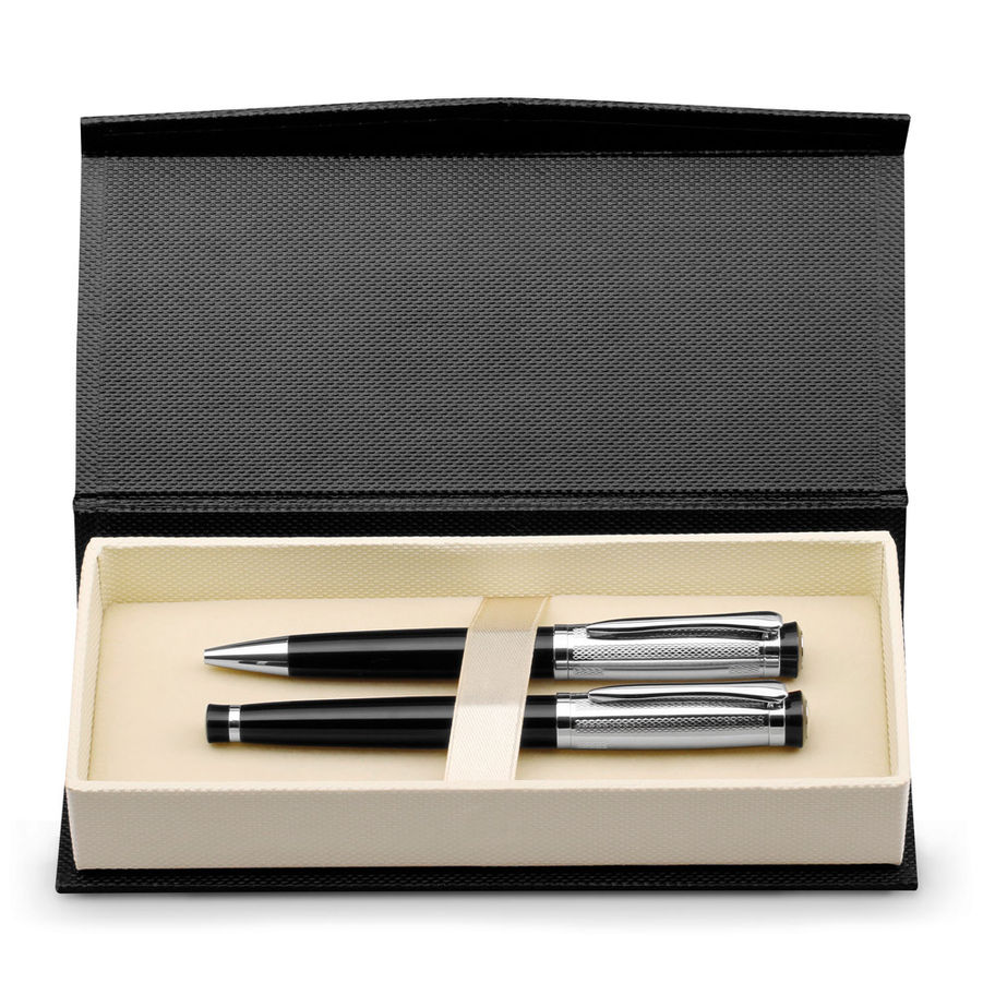 Conjunto de roller e esferográfica sofisticada, em aço com acabamento brilhante preto e tampa cromada com clipe de ferro. Escrita em azul, esferográfica até 1,5km de escrita. Fornecido em estojo presente almofadado.