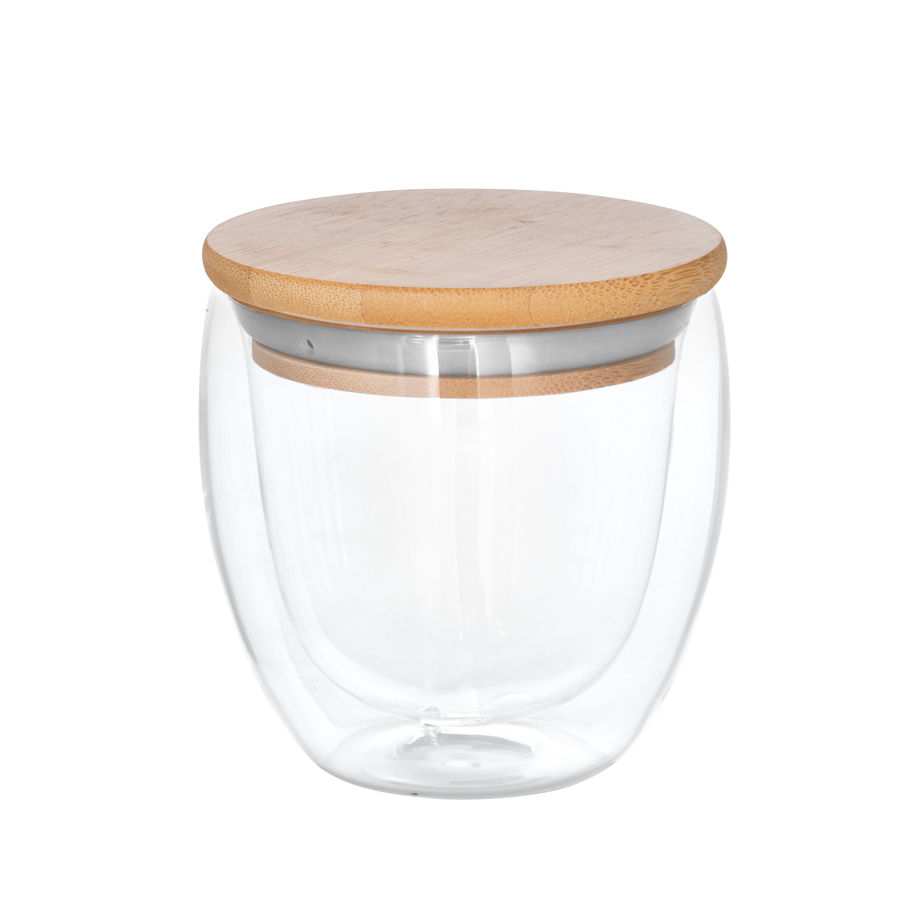 Copo em vidro isotérmico (borossilicato), térmico com parede dupla isolada a ar e tampa em bambu. Ideal para líquidos frios ou quentes, tendo uma tampa com isolante em silicone que facilita o transporte do copo evitando respingo. Apto para ir ao micro-ondas e à máquina de lavar, retirando a tampa. Fornecido em caixa presente de papel kraft. A cor e o resultado da impressão nos materiais naturais pode variar entre produtos.