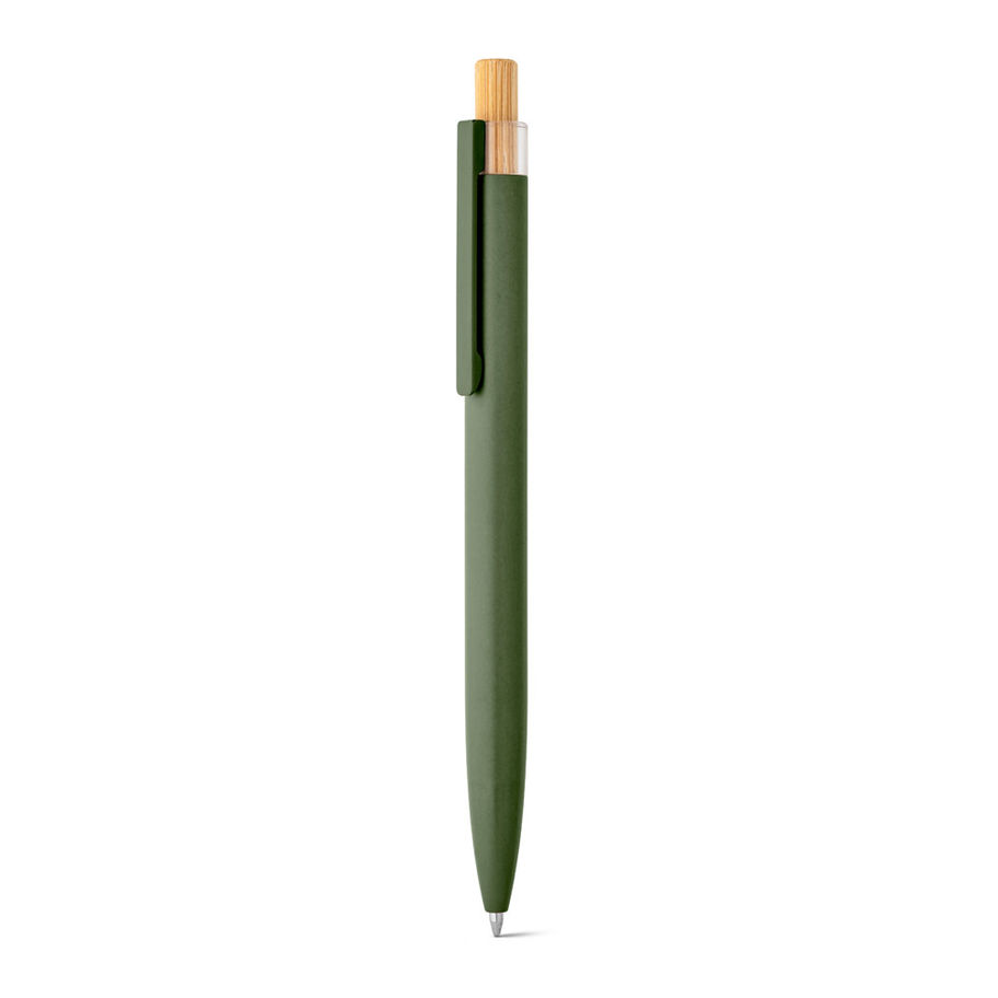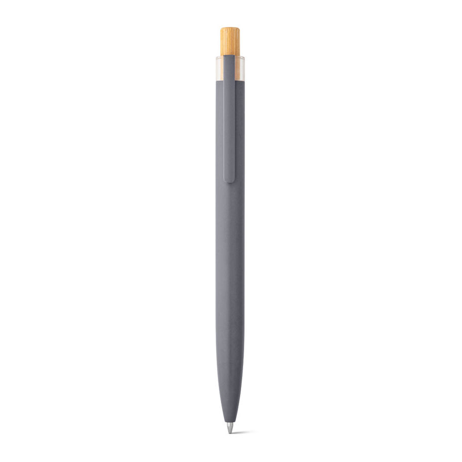 Esferográfica com corpo em alumínio 100% reciclado, topo em 100% rPET, botão em bambu e clipe de metal. Escrita em azul. A cor e o resultado da impressão nos materiais naturais pode variar entre produtos.