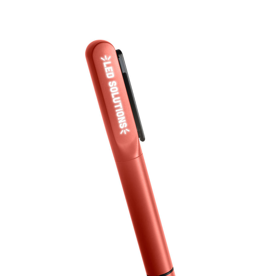 Esferográfica em alumínio 94% reciclado e escrita em azul. Quando personalizado no clipe permite que ao ser rodado ilumine o seu logotipo ou personalização. Fornecida em bolsa de oferta.