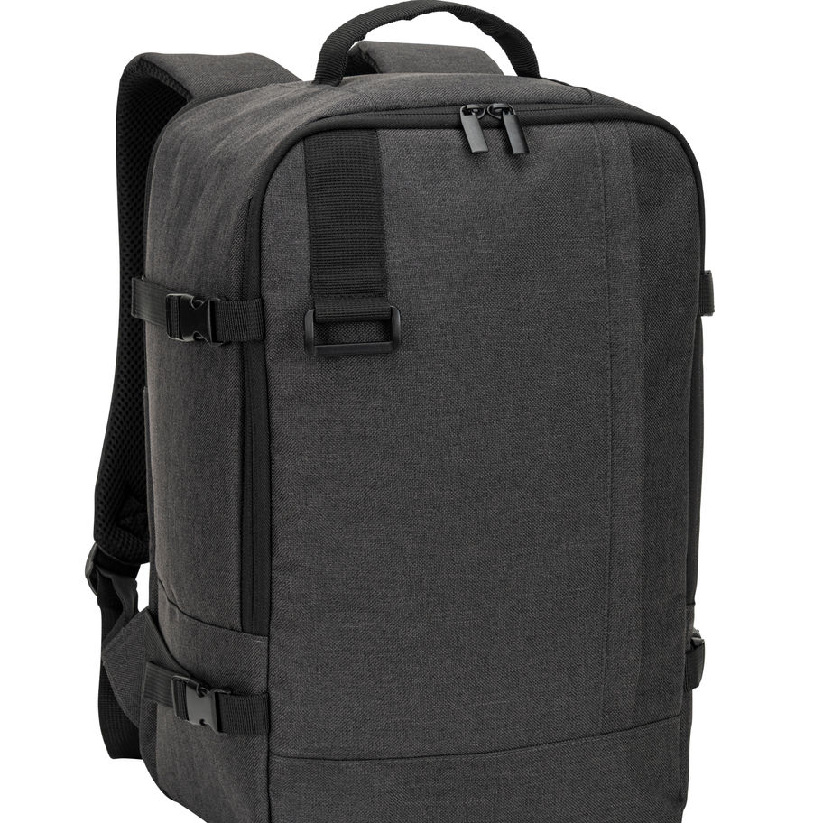 Mochila desenvolvida para cumprir as dimensões exigidas pelas companhias aéreas, permite-lhe viajar com tudo o que necessita como bagagem de mão. Composta em poliéster reciclado (rPET) 600D de alta densidade, com acabamento repelente à água, e forro em poliéster reciclado (rPET) 210D. Possui um compartimento principal amplo para roupa, um compartimento totalmente almofadado para um notebook até 14" e um bolso frontal. A mochila oferece-lhe um maior conforto nas suas viagens devido à sua pega superior almofadada, cintas de compressão nas laterais que lhe permite ajustar a dimensão da mochila ao seu volume e a parte posterior em malha com alça para trolley. A parte frontal dispõe de uma peça para pendurar um objeto, como por exemplo um Squeeze com mosquetão. Capacidade até 20 L.