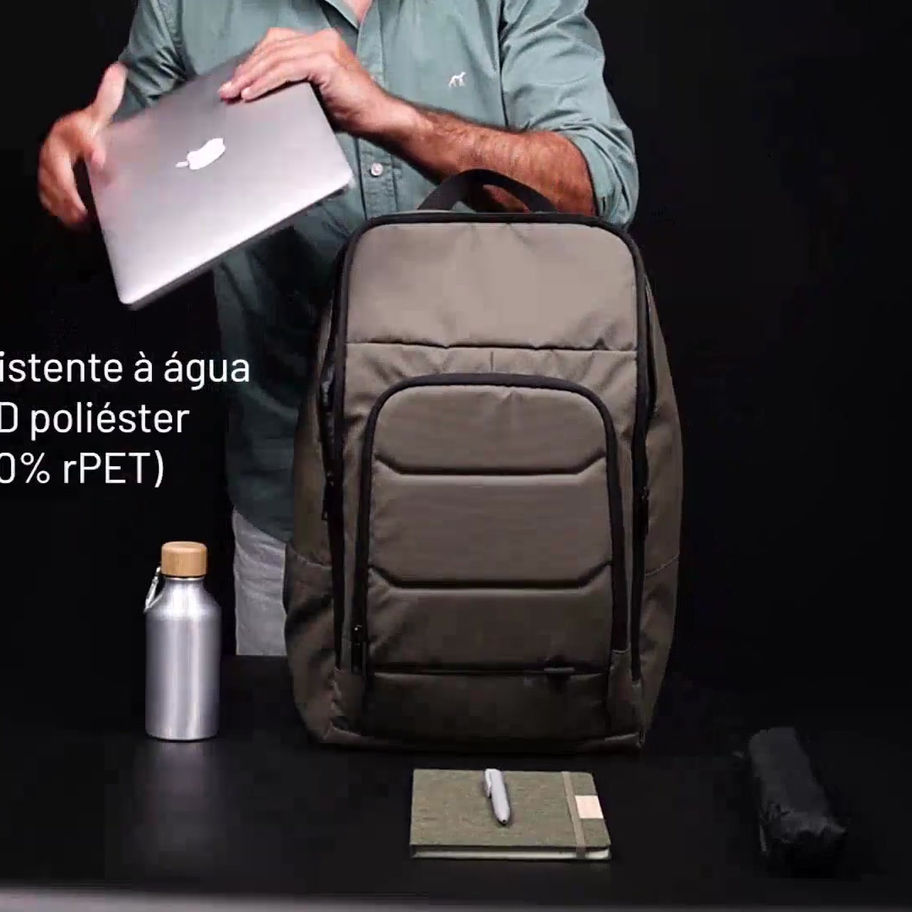 Mochila para notebook em 600D, poliéster reciclado (100% rPET), de alta densidade, com revestimento resistente à água e forro em 210D poliéster reciclado (100% rPET). Possui um compartimento principal com diversos bolsos e 2 divisórias almofadadas para notebook até 16" e tablet até 10.1". Bolso frontal com zíper com divisórias interiores. Bolso lateral ideal para transportar a sua squeeze. A parte posterior tem um acolchoamento extra e incorpora uma alça para trolley em caso de necessidade. Faixa refletora na parte da frente da mochila. Capacidade até 19 L.