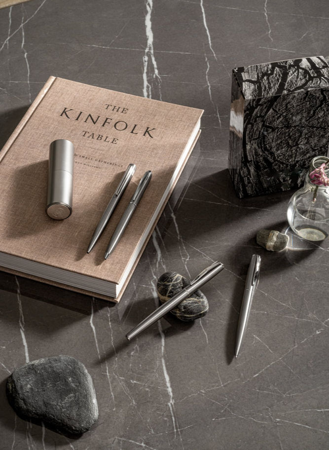 Conjunto de roller e esferográfica com corpo em aço inox 53% reciclado e clipe. Esferográfica com mecanismo twist e escrita até 5 km. O conjunto tem escrita a preto. Fornecido em caixa oferta de papel kraft proveniente de uma gestão florestal sustentável.