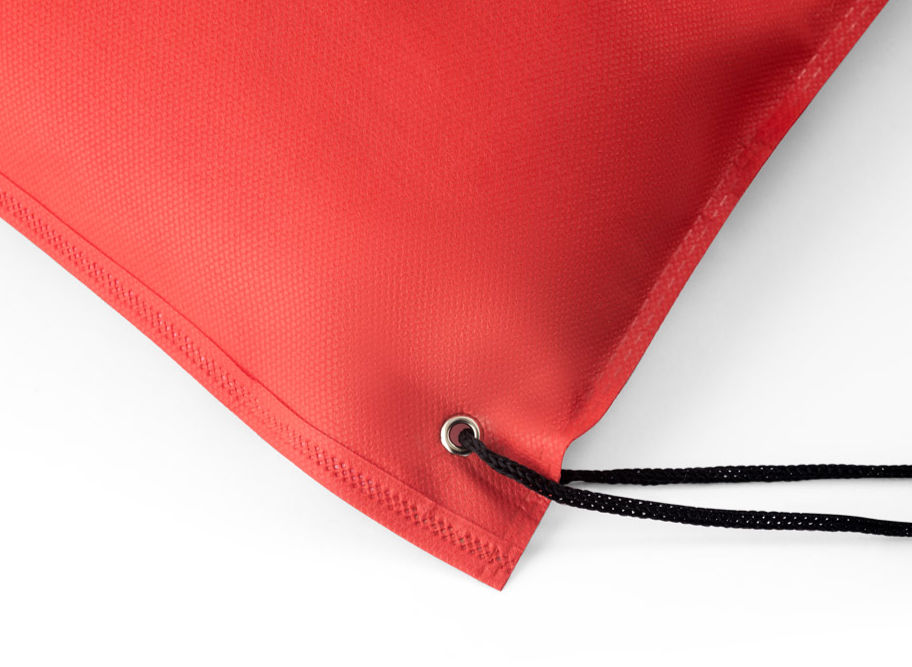 Sacola tipo mochila em non-woven (80 g/m²) termo-selado com ilhós de metal e cordão 4/1 preto.