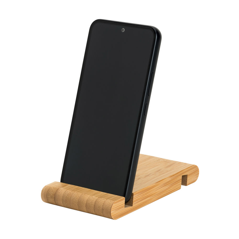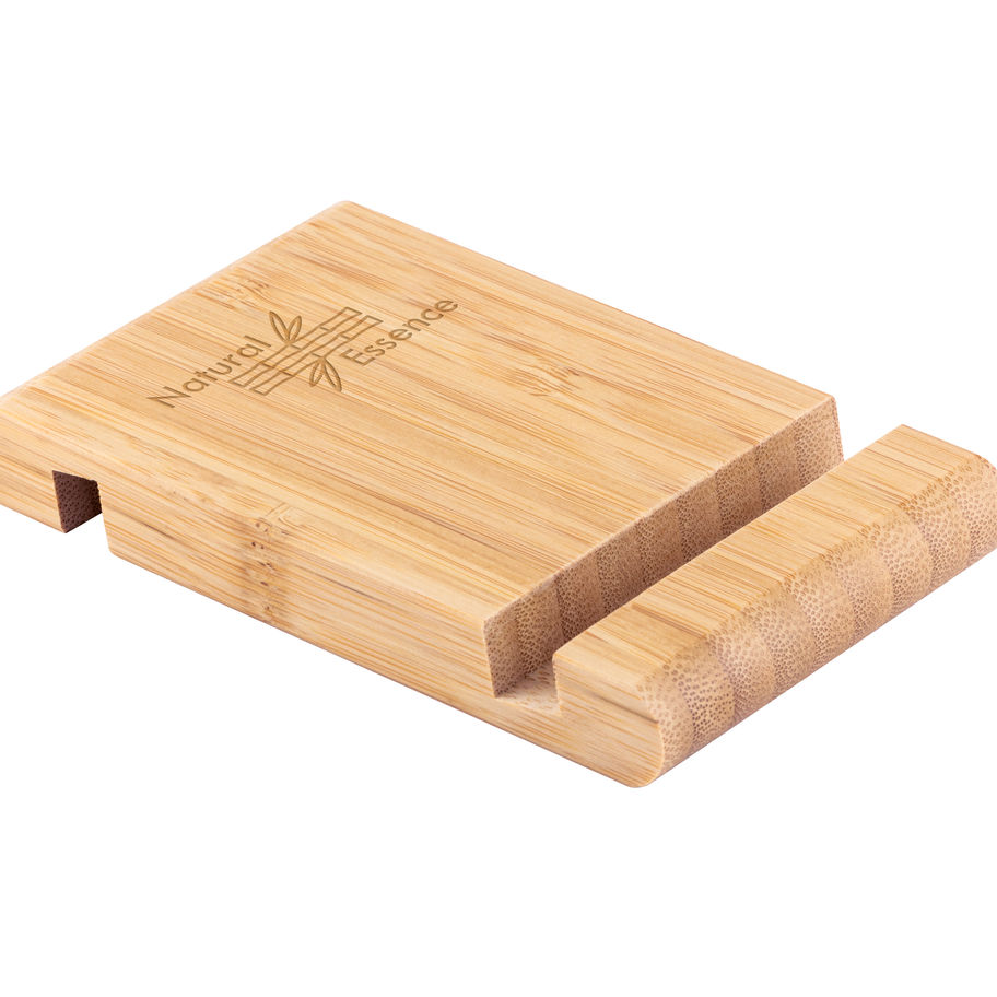 Suporte para celular em bambu, com 2 canaletas de tamanhos diferentes, uma em cada lado. A cor e o resultado da impressão nos materiais naturais pode variar entre produtos.